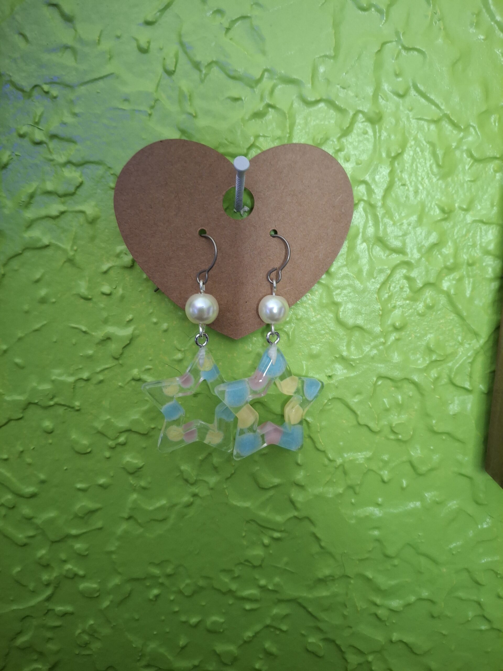These cutesy clear star earrings have pink, yellow, and blue inclusions in acrylic stars. They’re topped with a white pearl bread, and measure 2.5 inches long from top of hook to bottom of star.