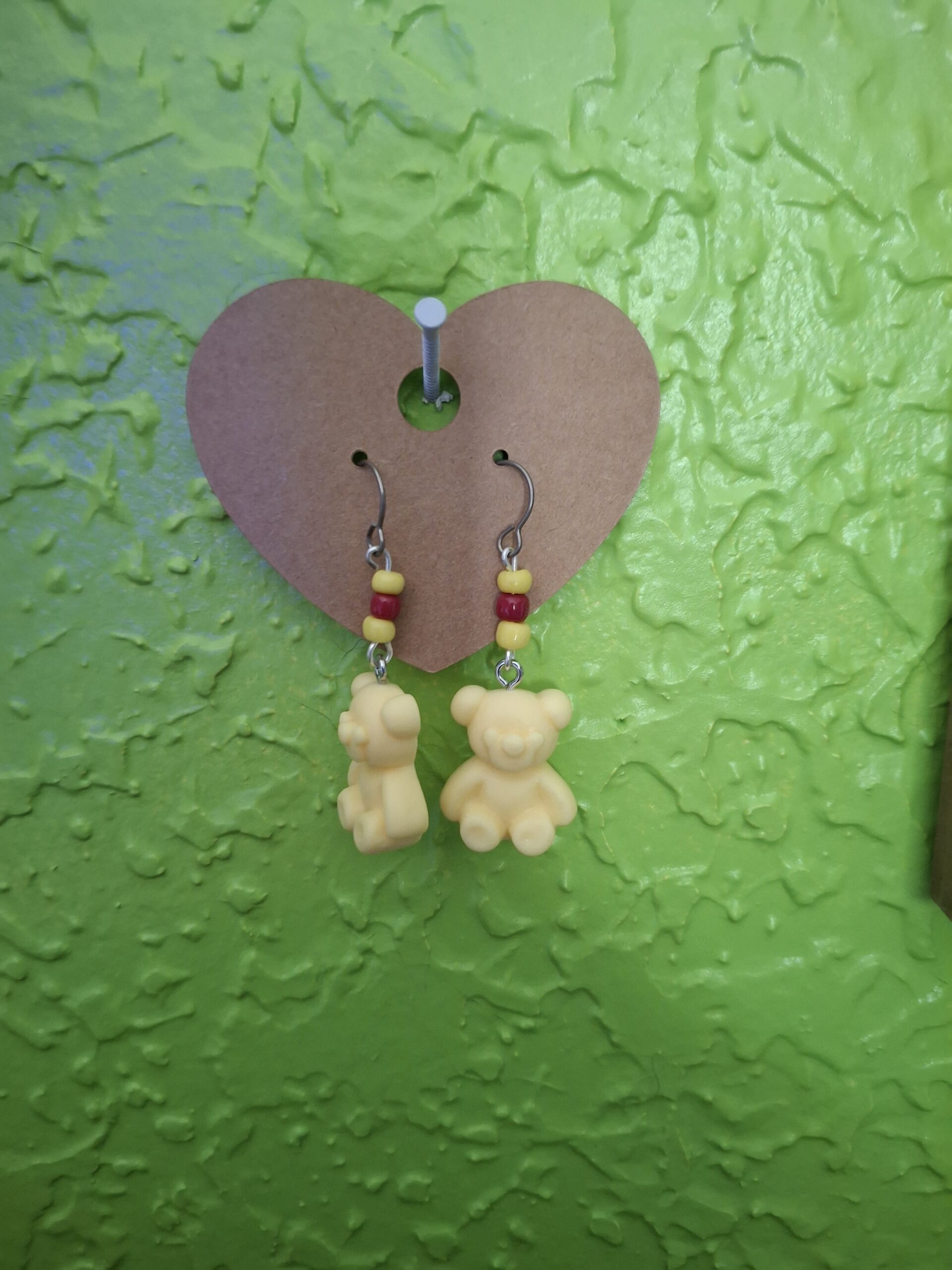 Cutesy pink teddy bear earrings dangling from titanium ear wires. Topped with red and yellow glass beads. Earrings measure about 2 inches long from top of hook to bottom of bear.