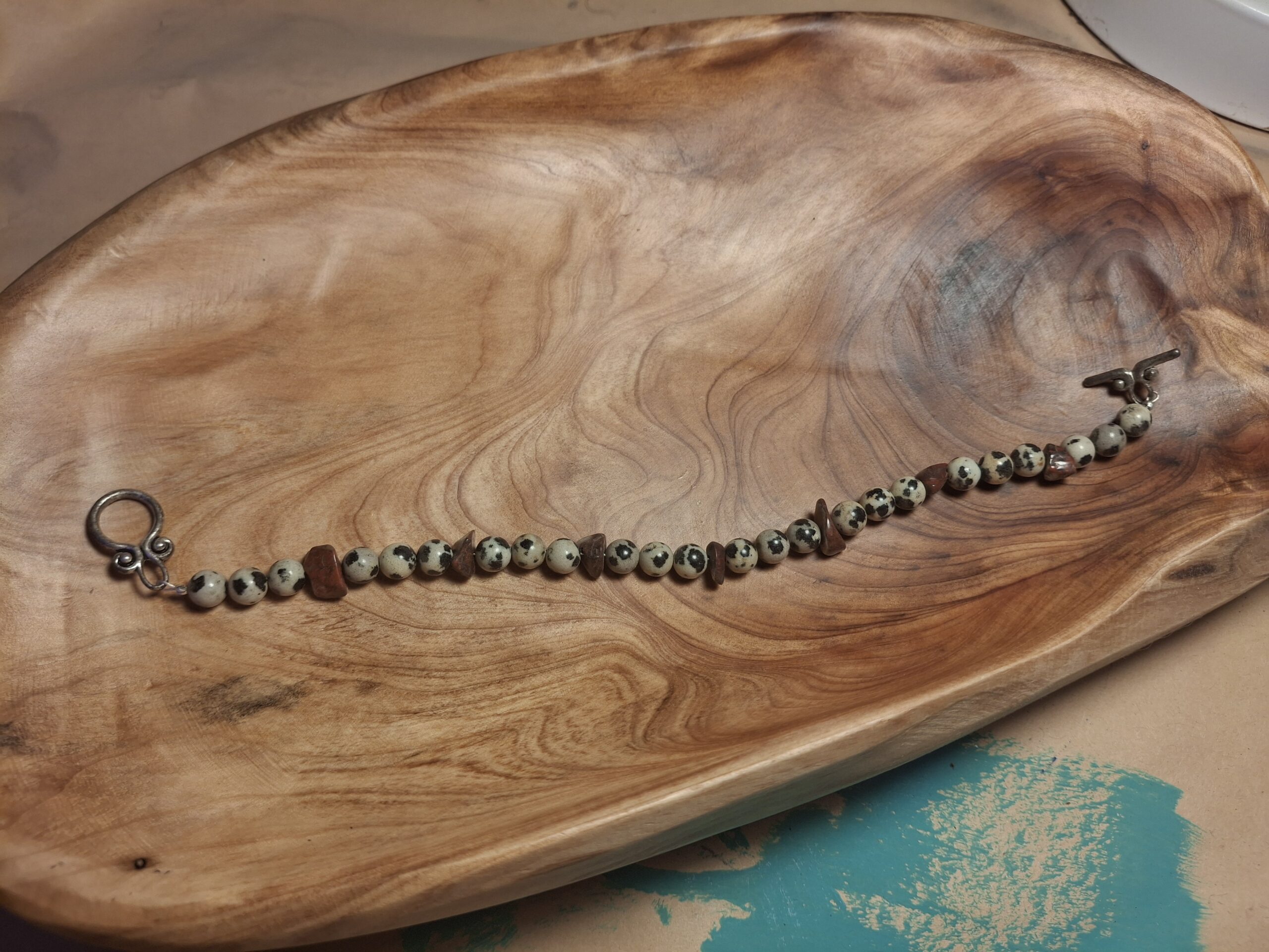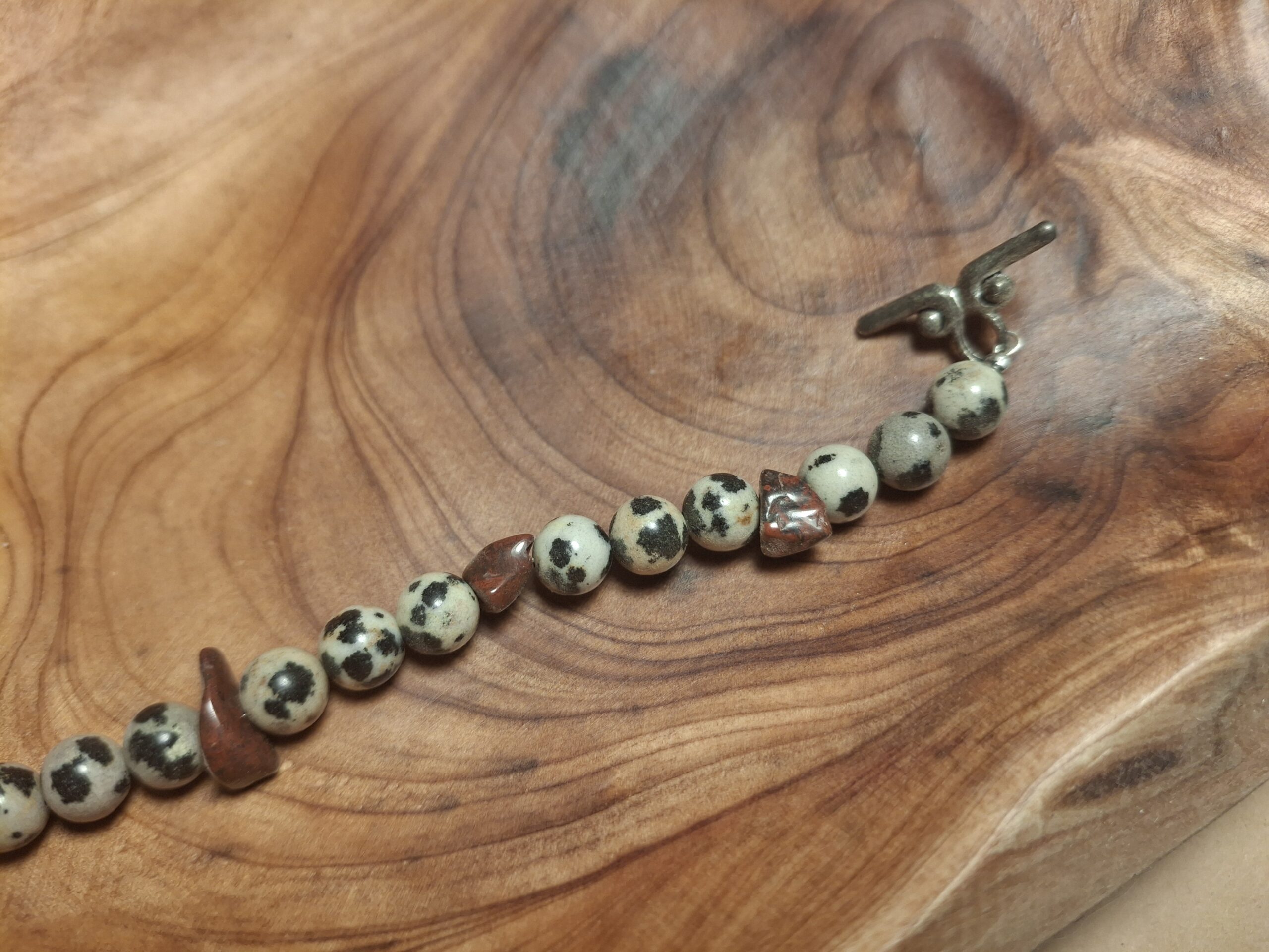 This dalmation jasper beaded bracelet measures just over 8 inches long from end to end and closes with a silver-toned toggle clasp. There are reddish brown stone beads placed between every 3rd and 4rd jasper bead. I am unable to recall what type of stone the others are, unfortunately.