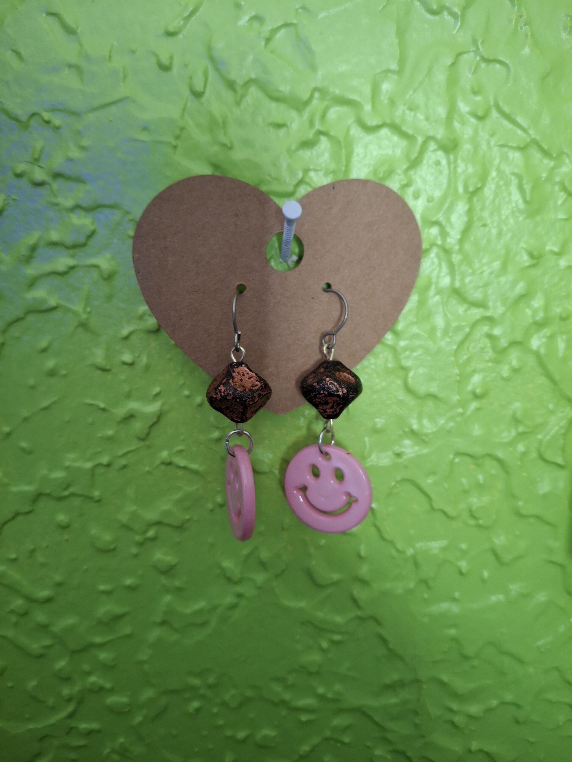 When you wear these, you won’t be worrying! Pink acrylic smiley faces underneath dark copper colored beads. They measure about 2 inches long from top of hook to bottom of earring. Titanium ear wires.