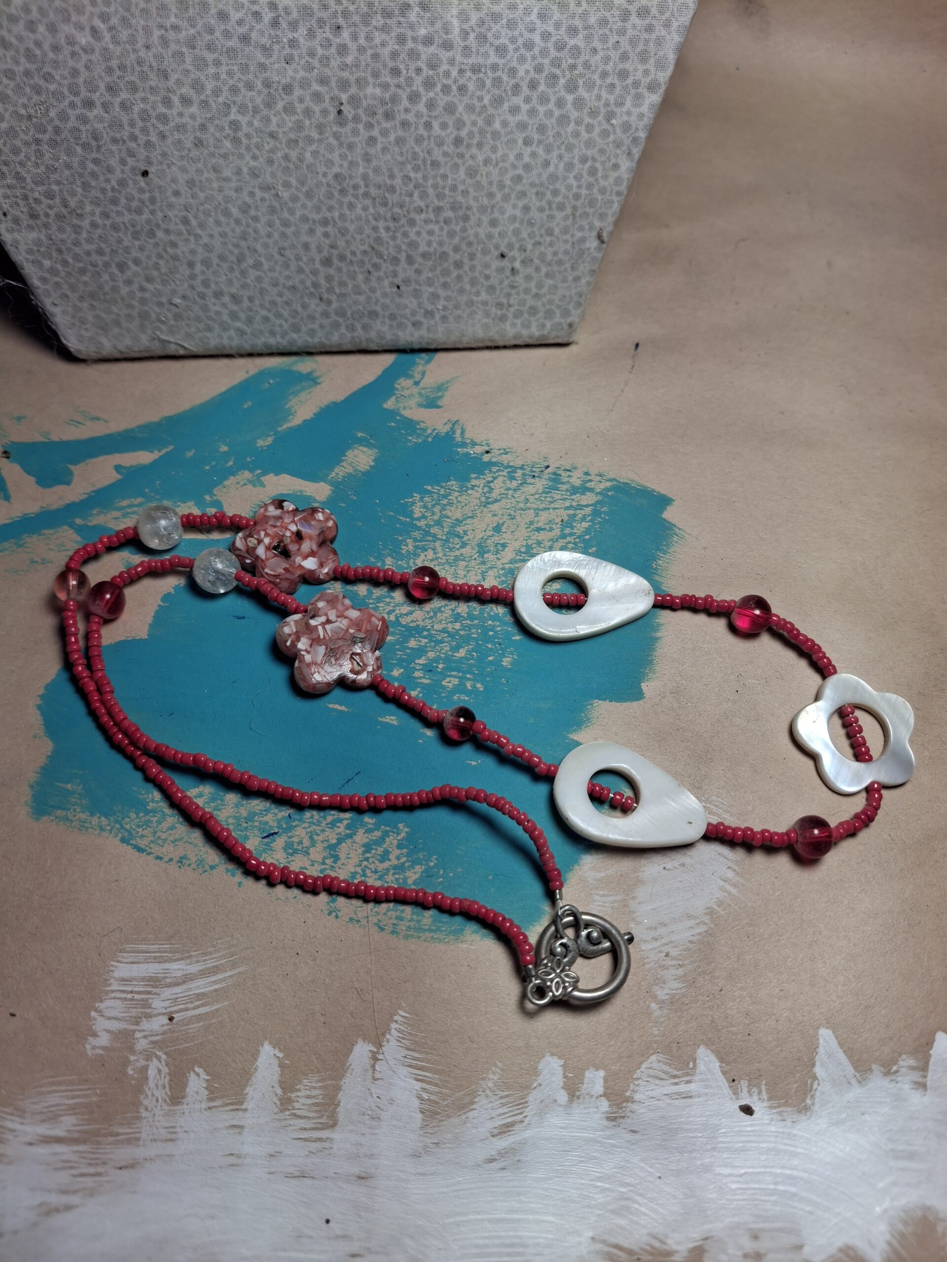 Flower power is back! Or is it? I don’t know, but this flower power necklace is cute! Made with strung seed beads in red, shell and resin flowers, and cute shell pieces, this necklace measures an approximate 21 inches long. It closes with a decorated silver-toned toggle clasp.