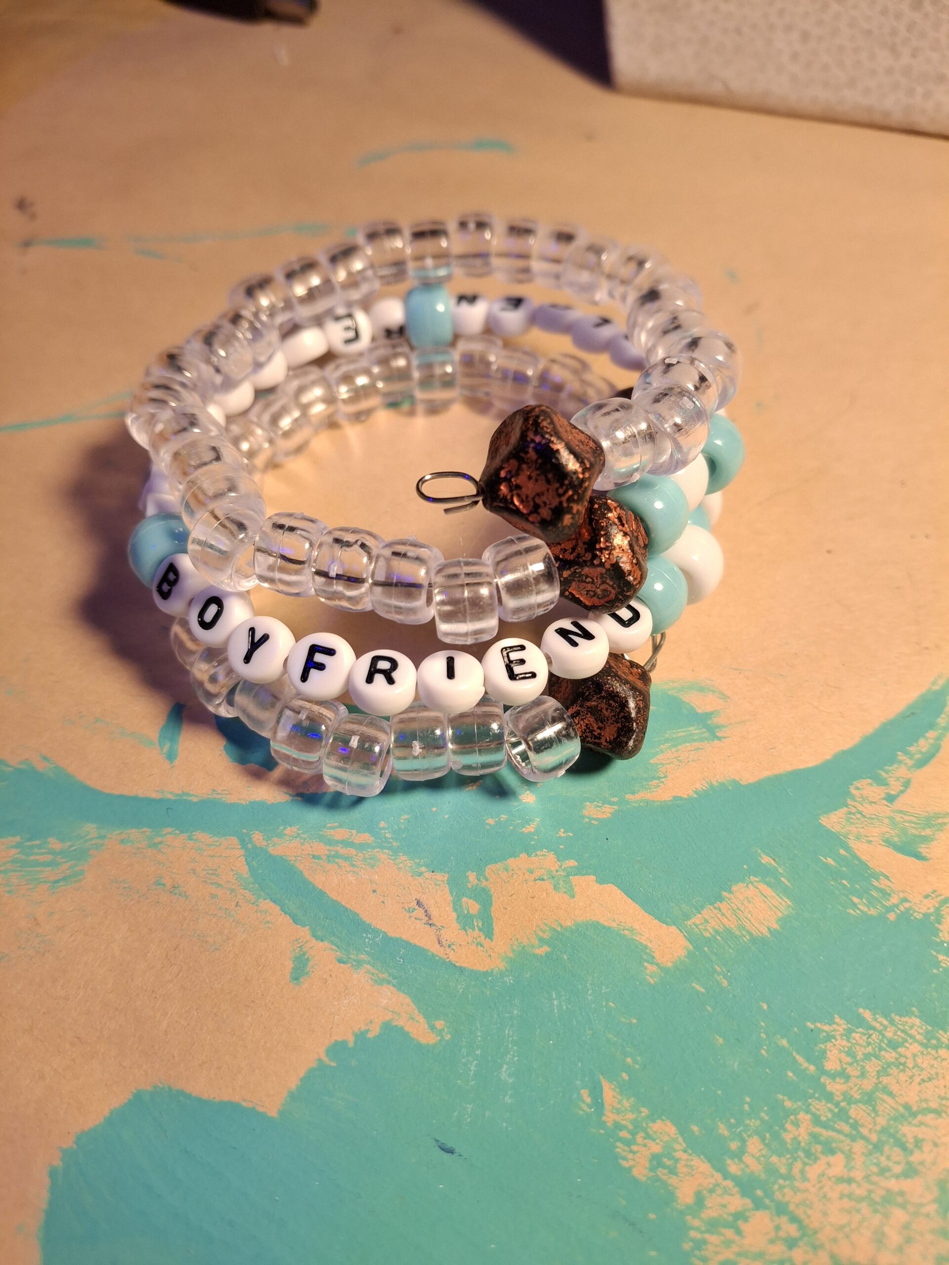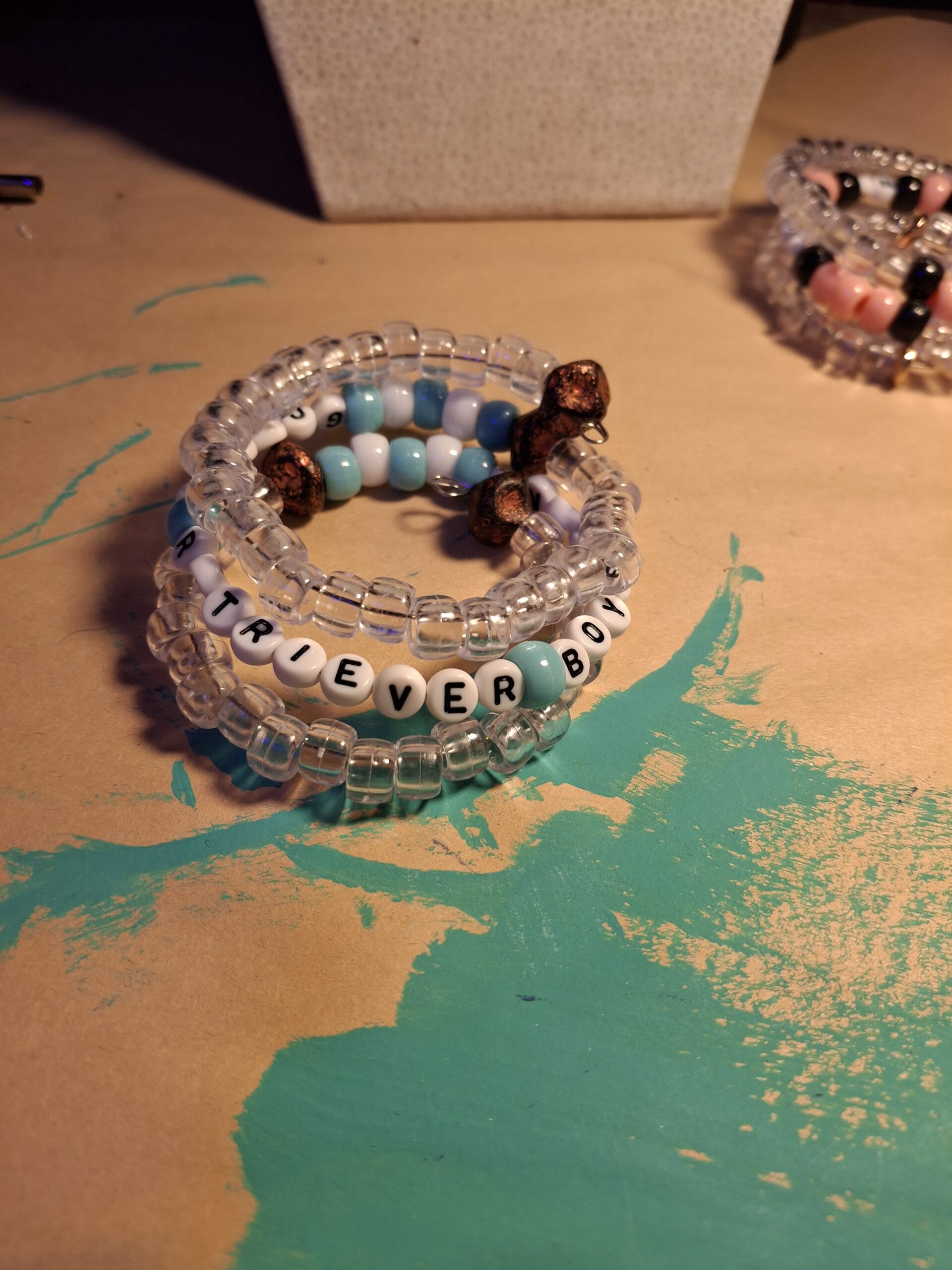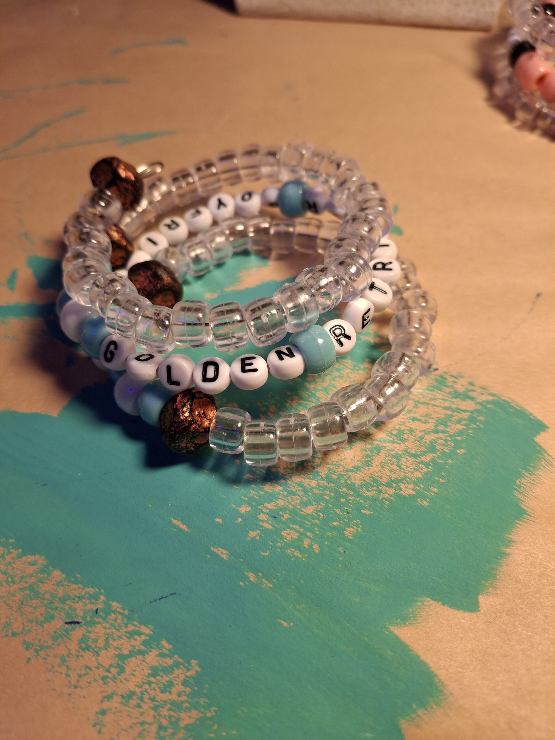 Pink and clear plastic pony beads with metal accents and alphabet beads spelling out Golden Retriever Boyfriend.