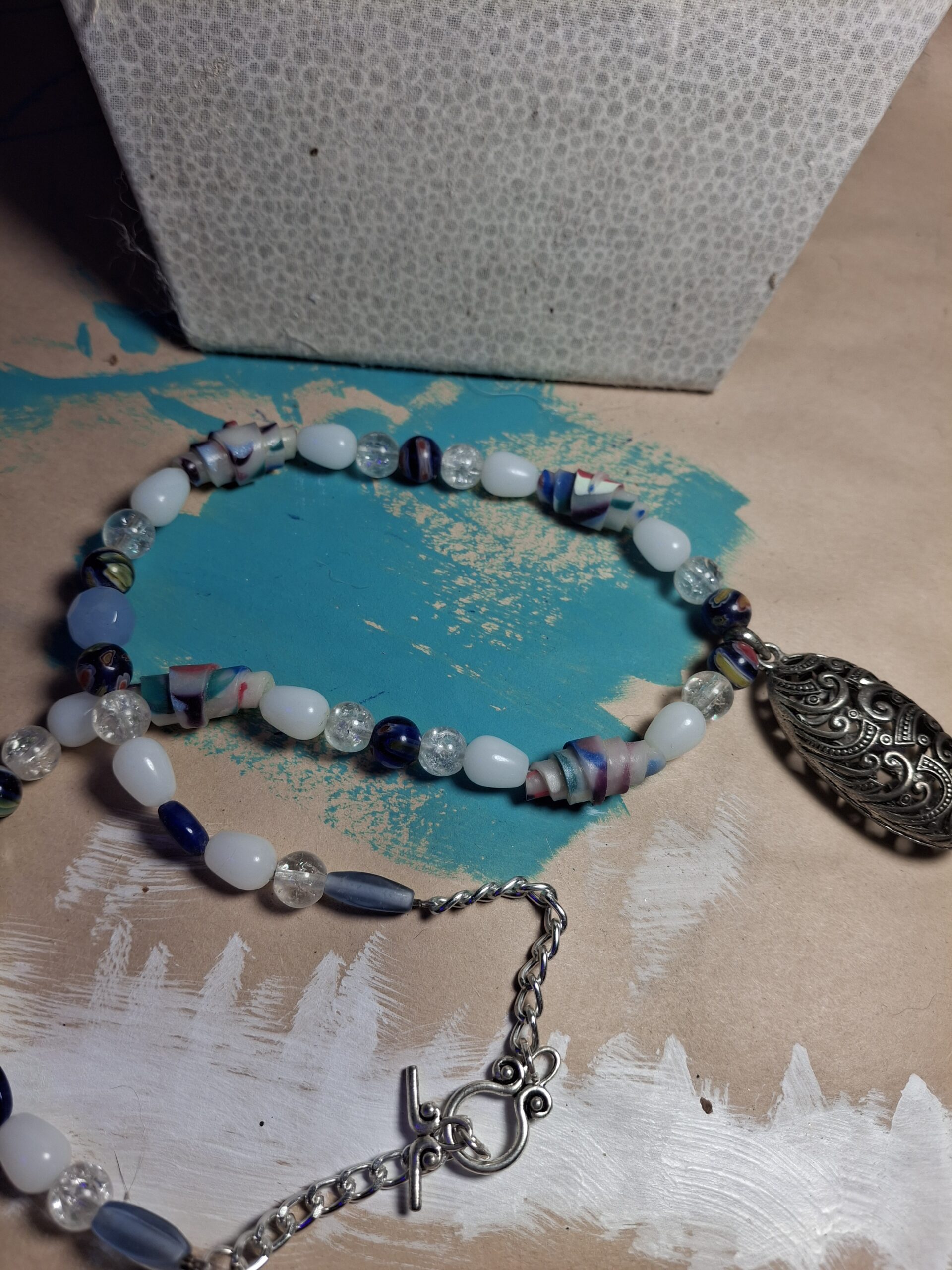 This unique polymer clay necklace features handmade polymer clay beads with bright colors, and various glass beads. At the center front it has a large metal pendant, with a heavy filigree design. The ends are simple silver-toned chain, and it closes with a toggle clasp. The necklace measures approximately 20 inches long.
