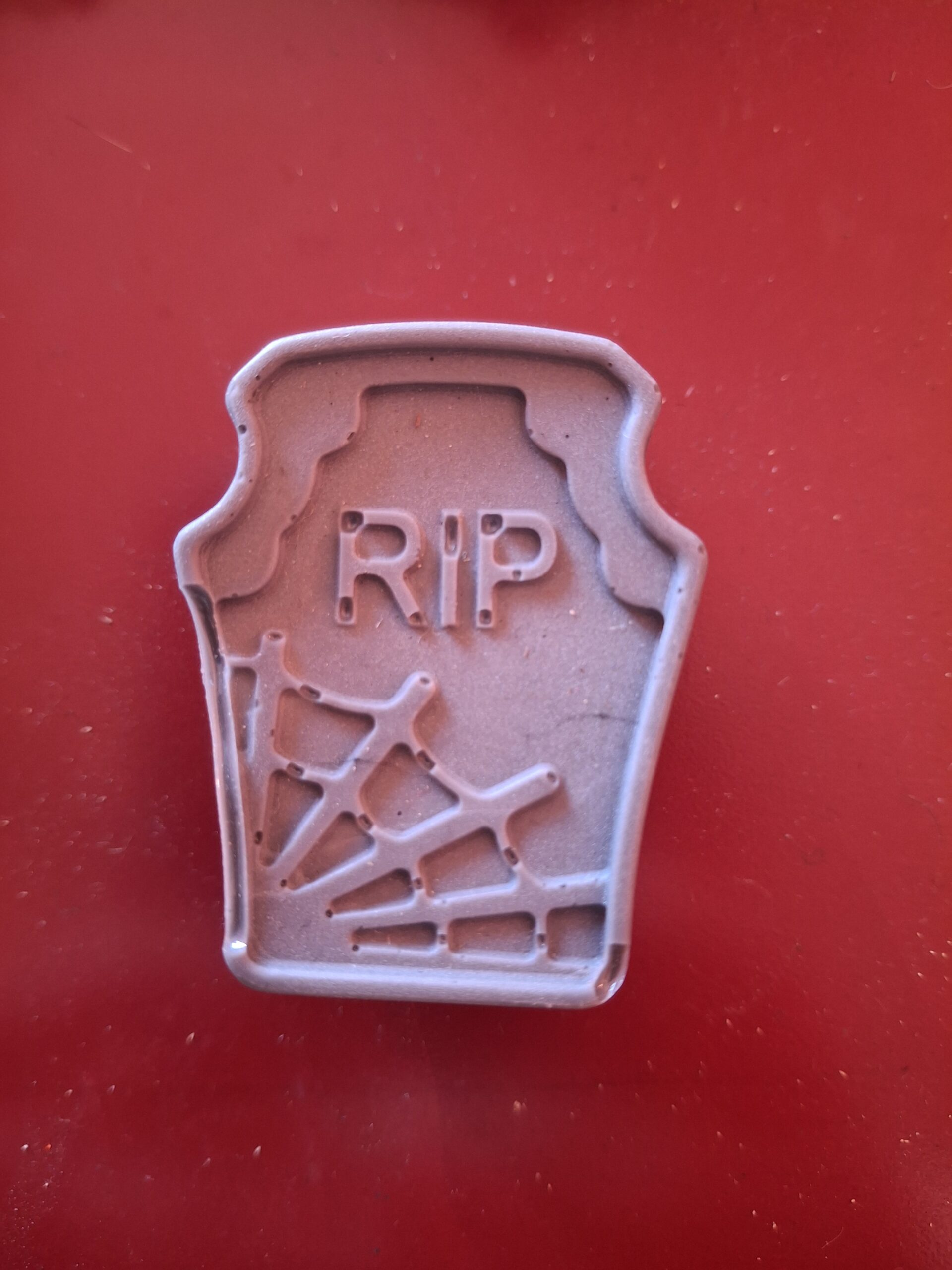 A spooky RIP gravestone magnet for your fridge! Measures 1.3 inches wide by 1.75 inches high. It has a strong magnet glued onto the back of the resin. Mostly gray resin. There’s a spider web across the bottom corner.