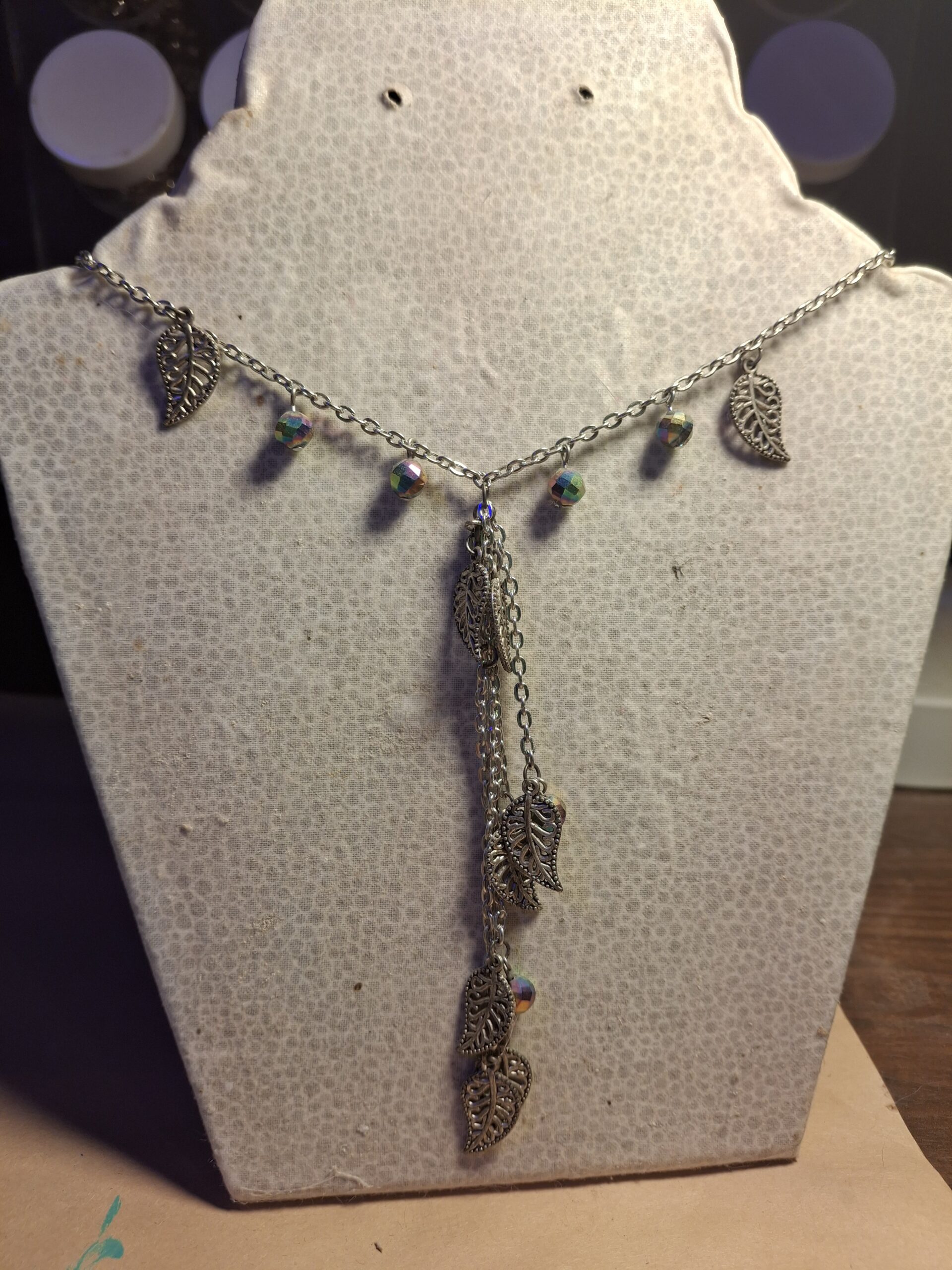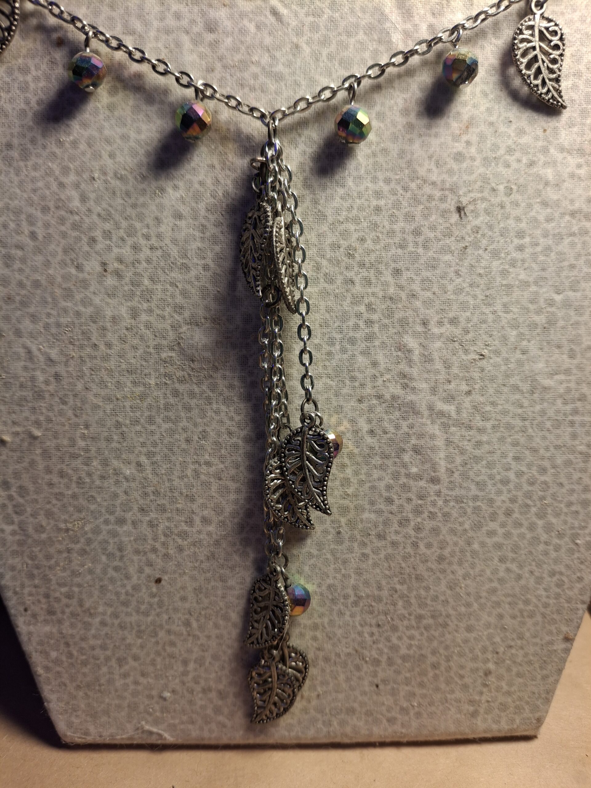 This necklace has delicate silver-toned leaves hanging from the chain, and from a central cluster made up of matching chain and small aurora borealis finished glass faceted beads. Its overall very feminine looking and one of my favorite recent creations. The necklace measures about 19 inches long and the pendant is an additional 4 inches. The chain is very bright. Closes with a silver-toned toggle clasp.