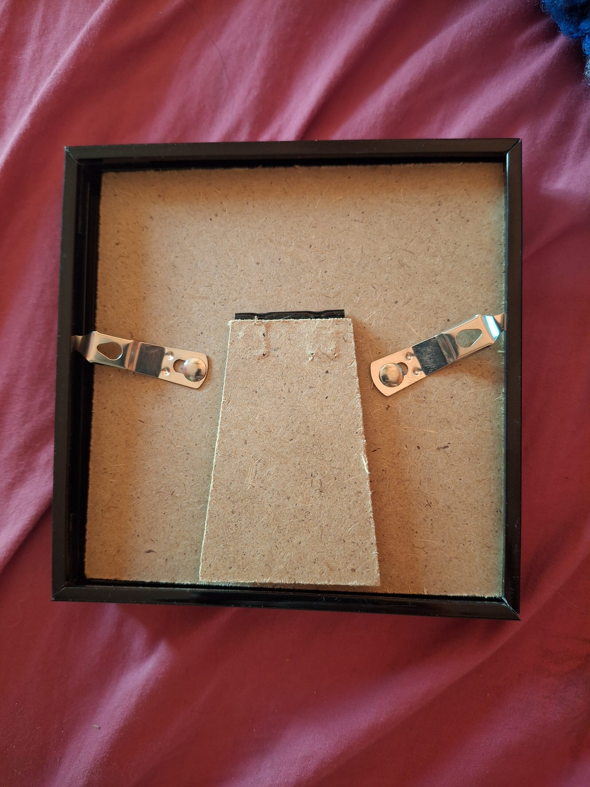 Tiny TNG Geordi cross stitch in a black frame. Frame measures 4.25 inches square. I designed this pattern myself and stitched it.